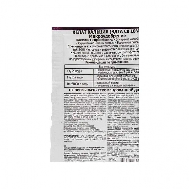 Микроудобрение Хелат Кальция 5г предназначен для полива и опрыскивания овощных, цветочно-декоративных, плодово-ягодных культур в качестве профилактики недостатка кальция (хлороза) в растениях. Высокоэффективен в диапазоне pH 5-10ю.