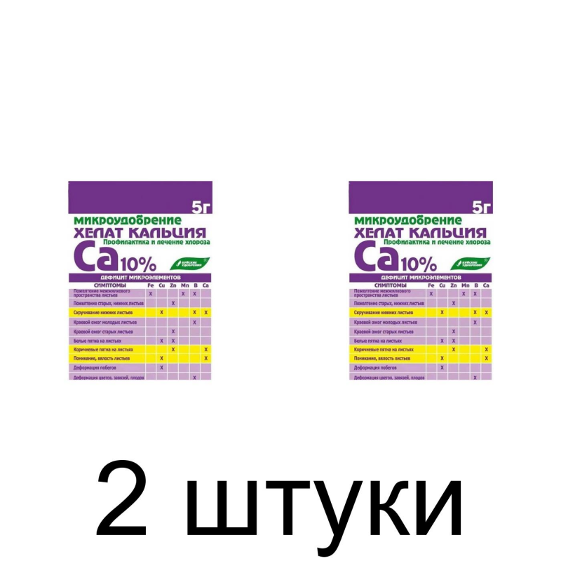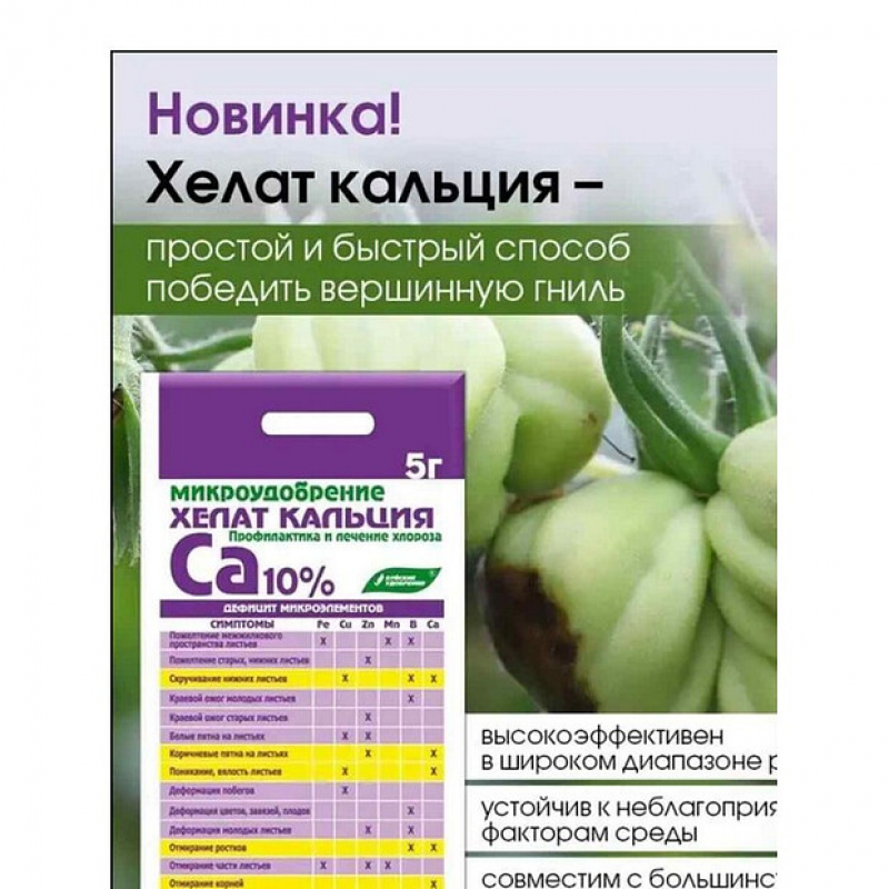 Микроудобрение Хелат Кальция 5г предназначен для полива и опрыскивания овощных, цветочно-декоративных, плодово-ягодных культур в качестве профилактики недостатка кальция (хлороза) в растениях. Высокоэффективен в диапазоне pH 5-10ю.