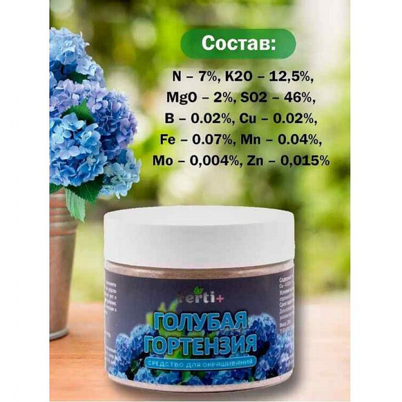 Средство для Гортензий Голубая усилитель насыщенности цвета Ferti+ - специализированное средство для голубых гортензий. Применяется для усиления насыщенности цвета соцветий гортензии. Так же средство благоприятно влияет на обильное цветение и на нормальный рост и развитие растений. Благодаря содержанию кальция в составе удобрения, pH почвы остается на подходящем для гортензий уровне, а входящее в состав железо в хелатной форме защитит растения от хлороза.