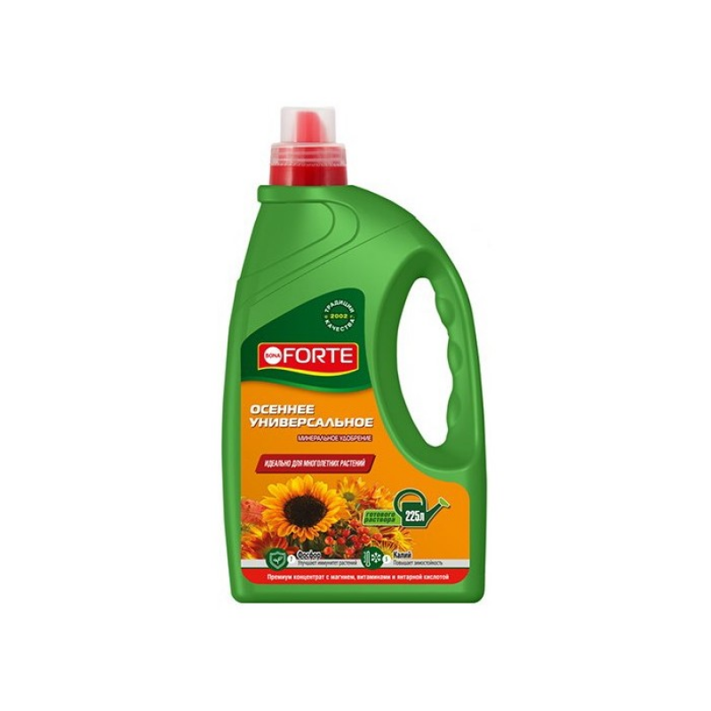 Удобрение BONA FORTE Осеннее универсальное (1,5л) — универсальное минеральное удобрение, предназначенное для всех видов растений. Оно обеспечит полноценное питание и поможет улучшить структуру почвы, поддерживая растения в осенний период.