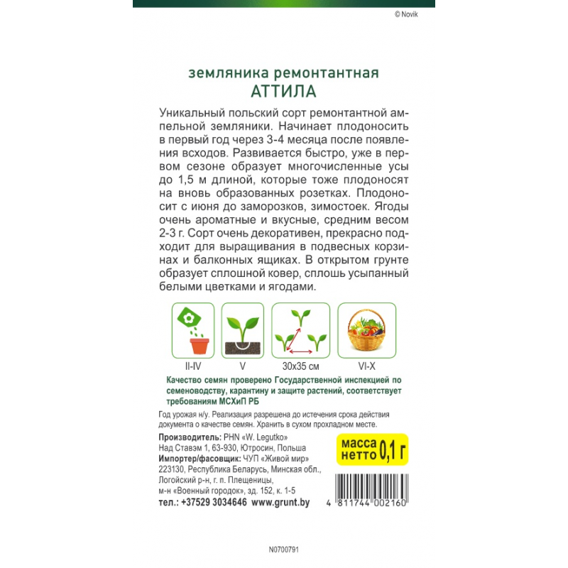Уникальный польский сорт ремонтантной ампельной земляники. Начинает плодоносить в первый год через 3 – 4 месяца после появления всходов. Плодоносит с июня до заморозков, зимостоек.