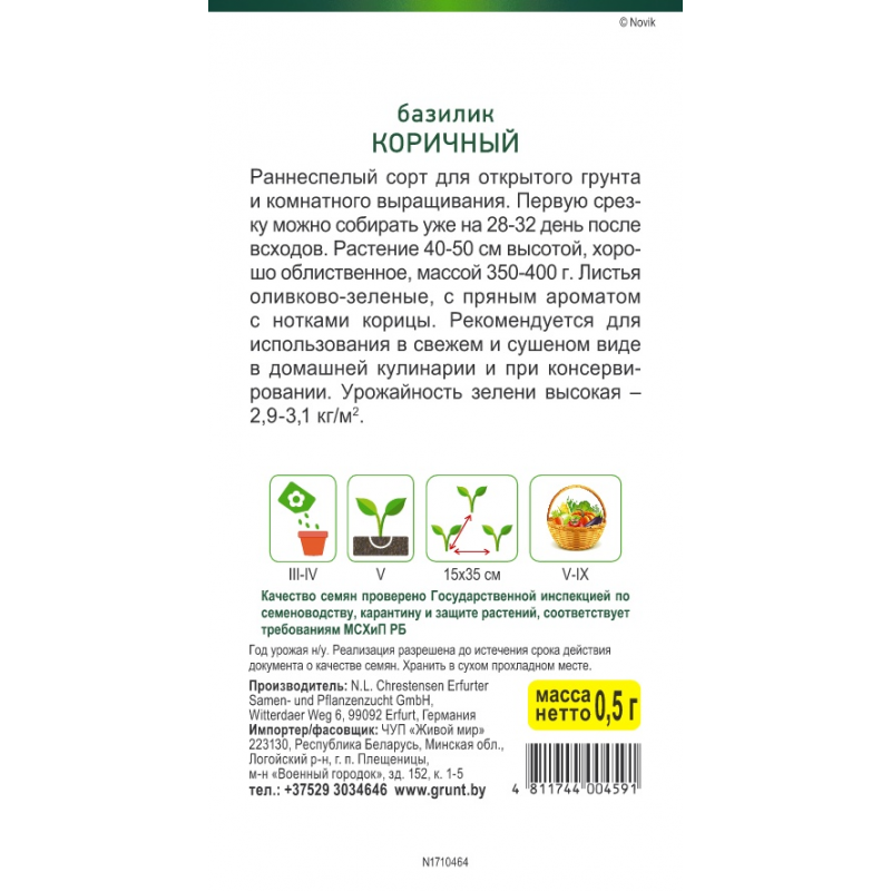 Раннеспелый Раннеспелый сорт для открытого грунта и комнатного выращивания. Первую срезку можно собирать уже на 28-32 день после всходов. Растение 40-50 см высотой, хорошо облиственное, массой 350-400 г. Листья оливково-зеленые с пряным ароматом с нотками корицы. Рекомендуется для использования в свежем и сушеном виде в домашней кулинарии и при консервировании. Урожайность зелени высокая – 2,9-3,1 кг/м2 .