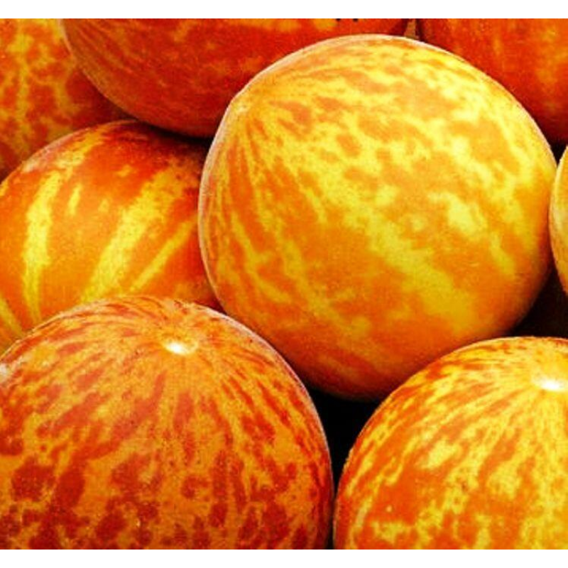 Этот сахарный сорт созревает всего за 55 дней. Растение мощное, до 3 метров, с короткими плетями 2-3 порядков. Плоды небольшие – 100-200 г, округлые или овальные, с ярко-оранжевой кожурой и желтоватыми полосами, будто солнечные зайчики на грядке. Мякоть – светло-кремовая или нежно-оранжевая, сочная, маслянистая, сладкая, с насыщенным ароматом. Кожура очень тонкая, семена почти не ощущаются – дыньки едят прямо с куста, как лакомство. Урожайность впечатляет: до 30 плодов с куста, созревающих конвейером до самых заморозков. Сорт высокоустойчив к болезням, погодным перепадам и прохладе, отлично подходит для средней полосы, где большинство дынь не успевает вызреть. В южных регионах такие сорта – обычное дело, а здесь – редкое чудо. Плоды хороши в свежем виде, а также идут на варенье, джемы, повидло, настойки и вино. Богаты витаминами и микроэлементами – вкус и польза в одном. В отличие от сортов для хранения, которые менее ароматны и сочны, эта дыня раскрывает весь свой потенциал, вызревая на грядке. Высокоурожайный, неприхотливый, болезнестойкий – один из лучших выборов для северных и умеренных широт.