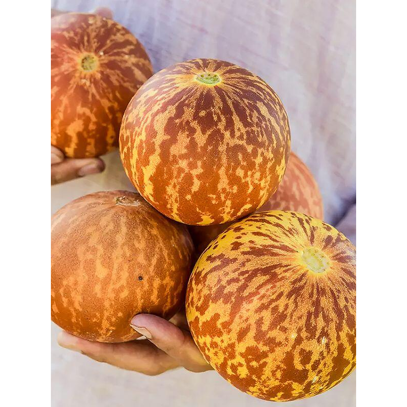 Дыня-малютка из Поднебесной – редкий гость с характером. Этот старинный китайский коллекционный сорт относится к сахарному подвиду и созревает всего за 55 дней. Растение мощное, до 3 м, с короткими плетями 2-3 порядков – компактное и урожайное. Плоды овальные, до 5 см в диаметре, с необычной светло-коричневой кожурой, будто покрытой природной патиной. Вес – 100-200 г, но урожайность впечатляет: до 30 плодов с куста, созревающих непрерывно до самых заморозков. Мякоть – белая, нежная, сочная, с маслянистой текстурой, насыщенной сладостью и ярким, стойким ароматом. Кожура очень тонкая, семена почти не ощущаются – дыньки едят целиком, прямо с грядки. Сорт высокоустойчив к болезням, засухе и прохладе, идеален для средней полосы и северных регионов, где большинство дынь не успевает вызреть. Здесь он – редкость, но настоящая находка. Плоды вкусны в свежем виде, а также идут на варенье, повидло, джемы, настойки и домашнее вино. Богаты витаминами и микроэлементами – польза и наслаждение в каждой дольке. В отличие от сортов для хранения, которые теряют сочность и аромат, этот раскрывается полностью, только если зрел на грядке. Высокоурожайный, неприхотливый, выносливый – один из лучших для короткого лета. Посадите – не пожалеете, особенно если в доме есть дети. Их восторг гарантирован. Агротехника Перед посевом семена рекомендуется закалить 1-3 дня в прохладном месте, а затем замочить на ночь в тёплой воде для лучшего прорастания. В южных регионах посадку можно проводить сразу в грунт, а в средней полосе и северных районах – лучше выращивать рассаду, чтобы получить урожай раньше и вырастить крепкие, здоровые растения. Посев проводят с начала марта, помещая семена в торфяные стаканчики и ставя их в тёплое (23-24 °C), тёмное место. После появления первого настоящего листка растения подкармливают, а через две недели процедуру повторяют. Высаживать рассаду на постоянное место можно после формирования 4 настоящих листочков. Перед посадкой в каждую лунку вливают стакан слабого раствора марганцовки для профилактики грибковых заболеваний. В теплице растения размещают на расстоянии 50 см друг от друга, в открытом грунте – 70 см. Для правильного формирования куста у рассады прищипывают стебель на 3-5-м листе. В теплице растения подвязывают к шпалере и ведут в один стебель: все боковые побеги до высоты 50 см удаляют, а последующие – прищипывают после третьего листа. В открытом грунте оставляют первые 3-4 завязи, после чего верхушку прищипывают для остановки роста. Ключ к богатому урожаю – своевременные поливы, прополка, рыхление почвы и регулярные подкормки на всех этапах роста.