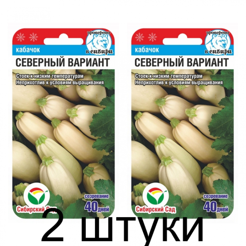 Кабачок Северный вариант (Семена Сиб Сад) — раннеспелый холодостойкий и засухоустойчивый сорт, подходящий для выращивания в открытом грунте во всех регионах России, включая Сибирь и Дальний Восток. Сорт гарантирует стабильный урожай даже в неблагоприятных климатических условиях. Период от всходов до сбора первых плодов составляет всего 38-40 дней.