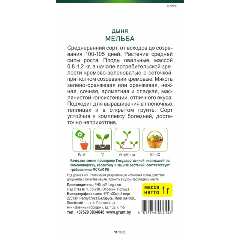Среднеранний Среднеранний сорт, от всходов до созревания 100-105 дней. Растение средней силы роста. Плоды овальные, массой 0,8-1,2 кг, в начале потребительской зрелости кремово-зеленоватые с сеточкой, при полном созревании кремовые. Мякоть зелено- оранжевая или оранжевая, нежная, сочная, ароматная и сладкая, маслянистой консистенции, отличного вкуса. Подходит для выращивания в пленочных теплицах и в открытом грунте. Сорт устойчив к комплексу болезней, достаточно неприхотлив.