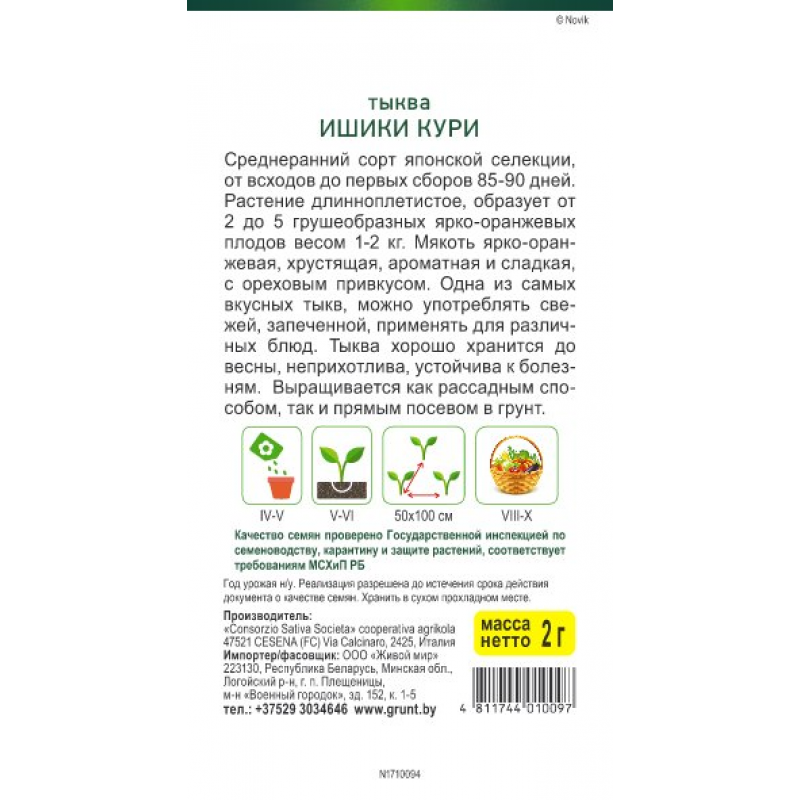 Тыква хорошо хранится до весны, неприхотлива, устойчива к болезням. Выращивается как рассадным способом, так и прямым посевом в грунт.