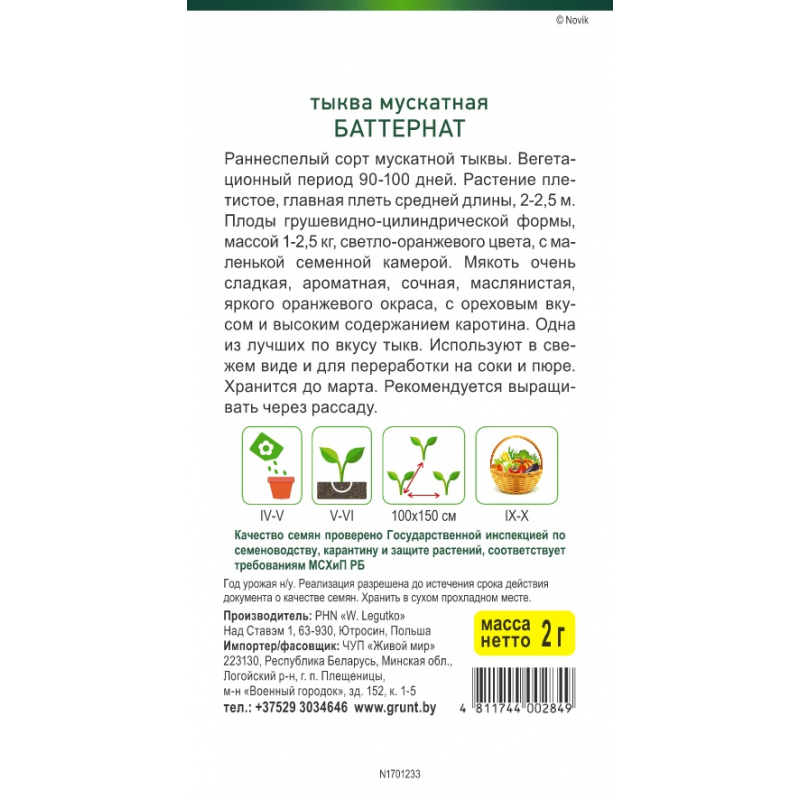 Среднеспелый гибрид мускатной тыквы, от всходов до созревания 105-120 дней.