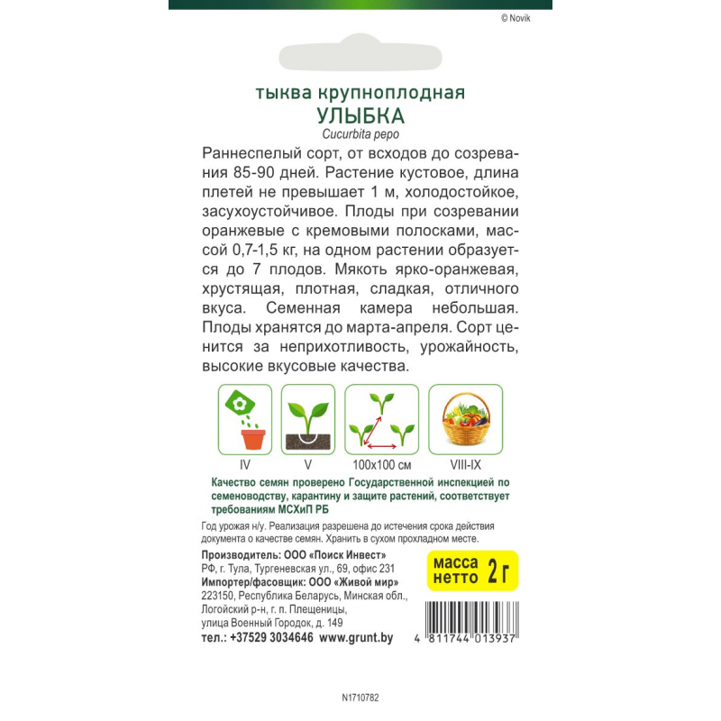 Раннеспелый Раннеспелый сорт, от всходов до созревания 85-90 дней. Растение кустовое, длина плетей не превышает 1 м, холодостойкое, засухоустойчивое. Плоды при созревании оранжевые с кремовыми полосками, массой 0,7-1,5 кг, на одном растении образуется до 7 плодов. Мякоть ярко-оранжевая, хрустящая, плотная, сладкая, отличного вкуса. Семенная камера небольшая. Плоды хранятся до марта-апреля. Сорт ценится за неприхотливость, урожайность, высокие вкусовые качества.