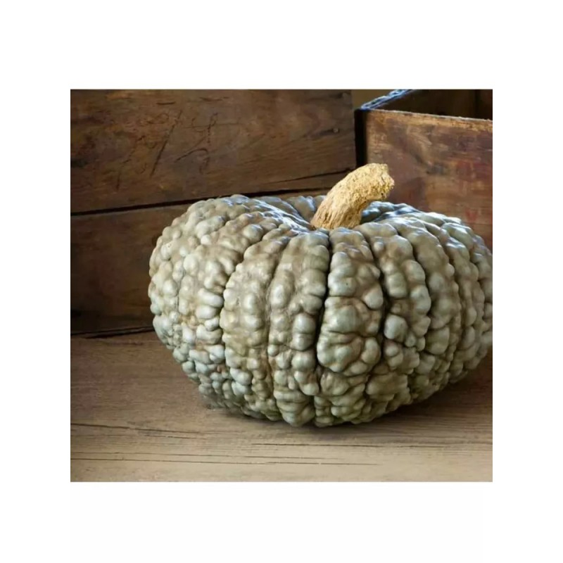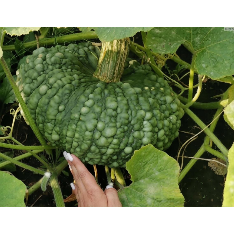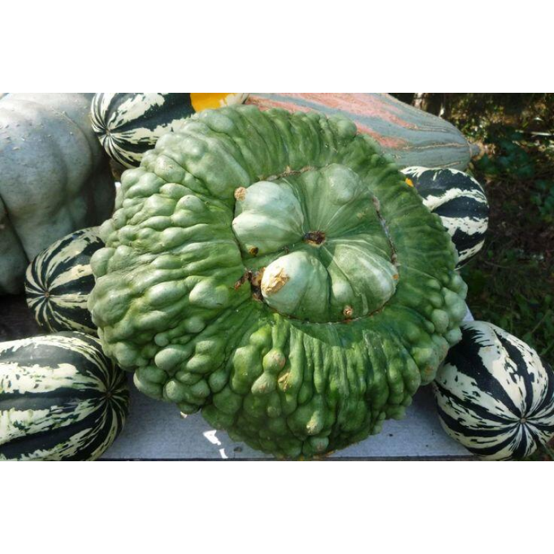 Среднепоздний (125-130 дней) сорт уникальной тыквы. Плоды круглые, плоские, некоторые в форме большого тюрбана, с морщинистой коркой, от серого до сине-зеленого и зеленого цвета, массой 10-12 кг. Мякоть желто-оранжевая, толстая, нежная, сладкая, невероятно вкусная. Благодаря высокому содержанию сахаров кулинарное использование данного сорта тыквы просто не ограничено. Из неё делают пудинги, торты, пирожные, цукаты. Сорт не имеет терпкости, в сыром виде его можно есть, как яблоко. Плоды могут храниться больше года без потери качества. Очень декоративна, украсит любую дизайнерскую композицию.