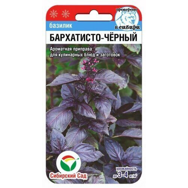 Один из лучших сортов фиолетового базилика Обладает пряноароматическими и лекарственными свойствами, особо декоративен. Период от всходов до технической спелости 50-70 дней.Растение среднеоблиственное, высотой до 40-50 см со слабопузырчатыми бархатистыми листьями, темно-фиолетового, почти черного цвета. Ароматные листья базилика содержат большое количество эфирных масел, обладающих дезинфицирующим и мочегонным действием, снимает спазмы желудка, способствует укреплению нервной системы и способствует лучшему перевариванию жиров. Базилик поднимает общий тонус, стимулирует пищеварение. Отвар листьев применяется при кашле и для полоскания рта. Рекомендуется для употребления в свежем и сушеном виде в качестве приправы (даже вместо черного перца), для ароматизации блюд в кулинарии, отлично пробуждает аппетит. Урожайность 3-4 кг зелени с 1 кв. м.Выращивают рассадным способом или прямым посевом в открытый грунт. Посев на рассаду производят в конце марта-начале апреля. Посев в грунт - в мае или начале июня. Высадка рассады в грунт - начало июня. Базилик предпочитает хорошо дренированные, суглинистые и супесчаные почвы. Дальнейший уход заключается в умеренном поливе, рыхлении и подкормке. Растение чувствительно к холоду.