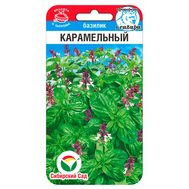 Базилик карамельный «Сиб Сад» — среднеспелый отечественный сорт с интенсивным фруктово-карамельным ароматом. Период от всходов до сбора зелени — 35–45 дней. Подходит для выращивания рассадным и безрассадным способом в открытом грунте в течение весенне-летнего сезона.