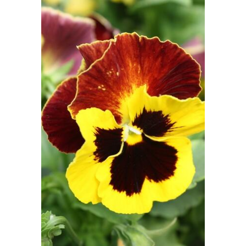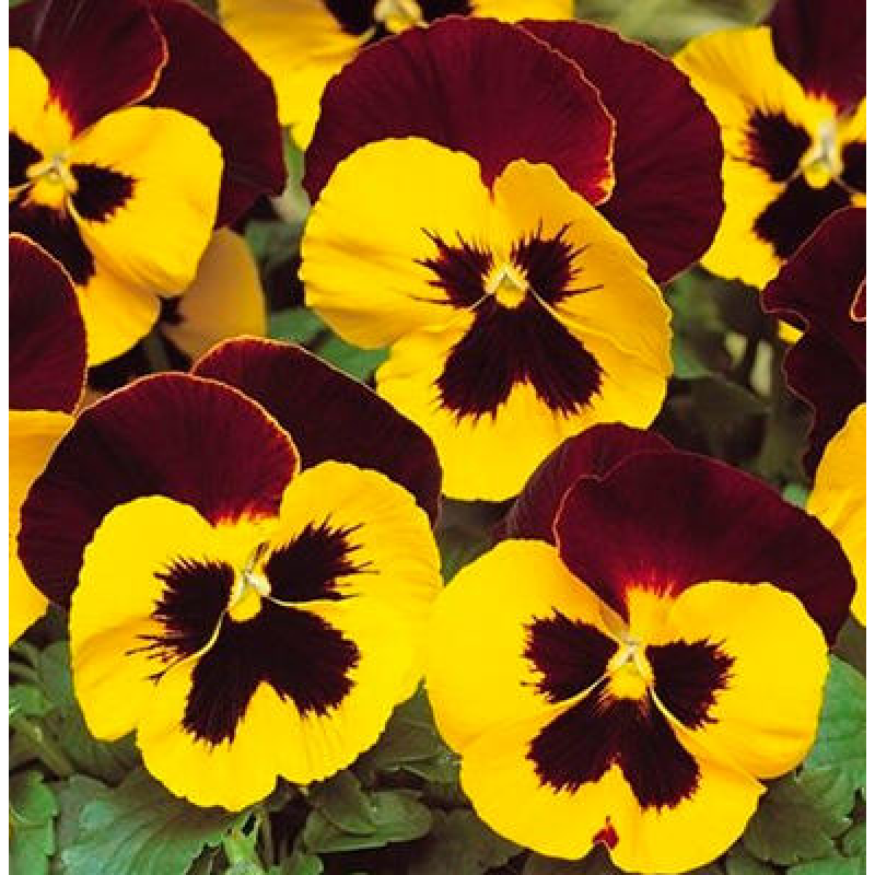Одни из самых любимых садовых цветов. Растение с быстрым ростом, красиво и обильно облиственное, с крупными цветками, сидящими на короткой и твердой цветоножке, высотой 15 см. Цветы крупные трехцветные. Верхние лепестки красно-бордовые, нижние желтые с черными пятнами у основания лепестков. Цветёт с июня до морозов. Используют для клумб и бордюров, в цветники - группами.