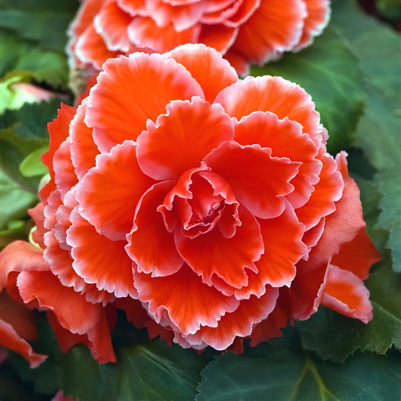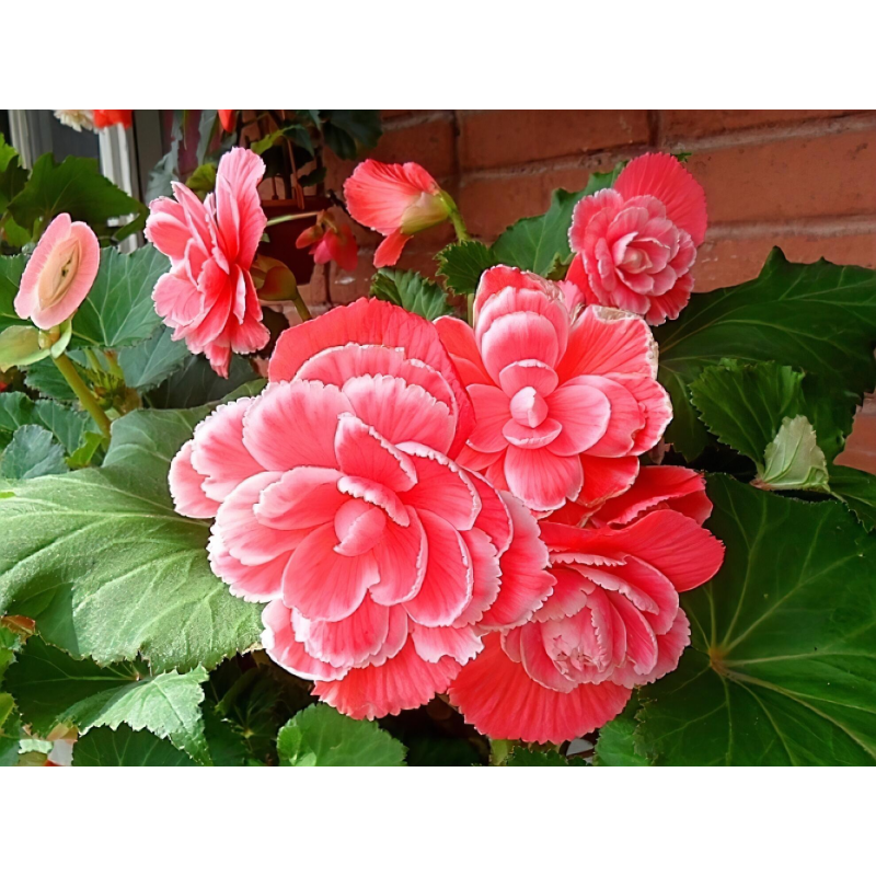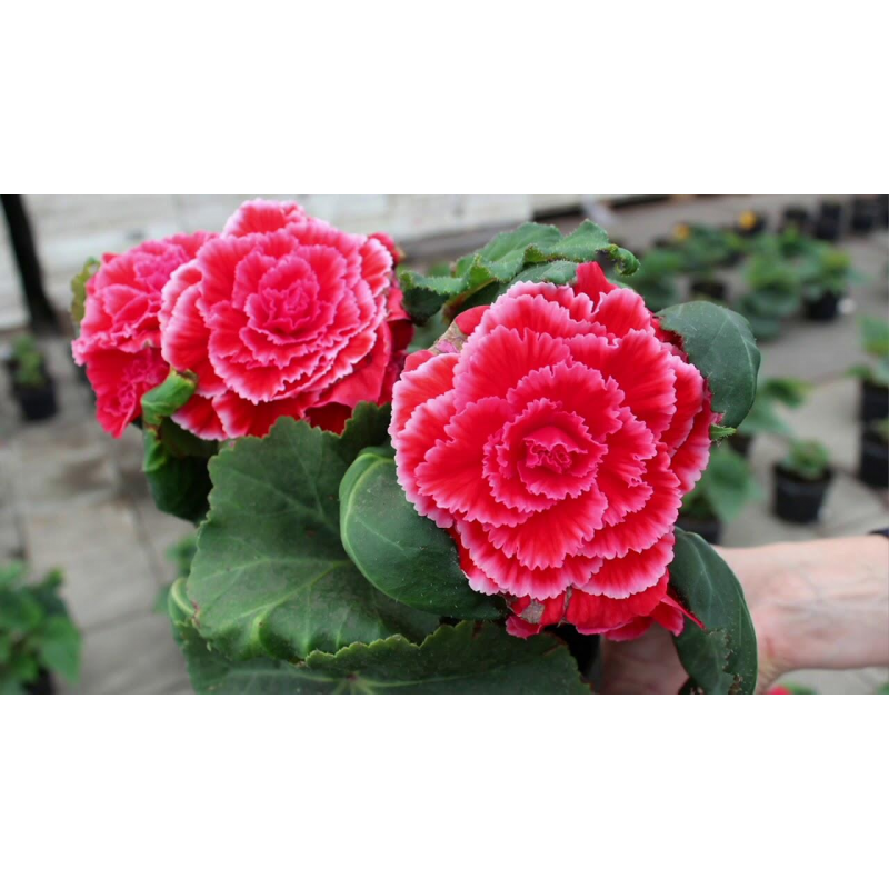 Очень яркая клубневая бегония. Растение компактное, хорошо разветвленное, с толстым стеблем и мясистыми темно-зелеными листьями, высотой 35-50 см и шириной 25-30 см. Цветки насыщенно-красные с тонкой белой каймой, очень крупные, диаметром 10-15 см (отдельные до 20 см). Цветение обильное, длительное, с июня до заморозков. Растение формирует крупный клубень, который можно сохранить до следующего сезона. Бегония великолепно смотрится на клумбах, в вазонах и балконных ящиках. На рассаду высевают в январе-феврале. Гранулы располагают на поверхности субстрата, слегка прижимают и накрывают стеклом или плёнкой. Для прорастания семян необходим свет и температура +22...+24 °С.