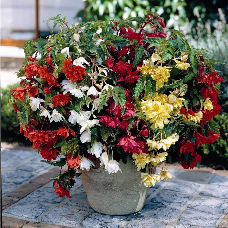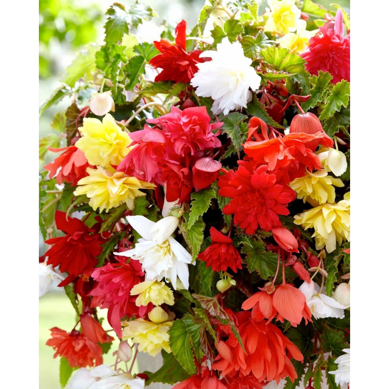 Красочная смесь клубневых ампельных бегоний с махровыми и полумахровыми цветками.