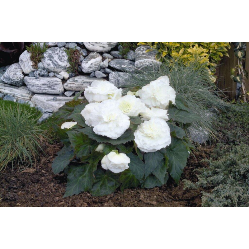 Красивая крупноцветковая бегония. Растение образует компактный кустик с толстыми разветвленными побегами высотой 30-35 см. Цветение обильное и длительное. Цветки белоснежные, густомахровые, очень крупные, 10-12 см в диаметре. Сорт хорошо растет в полутени, при обильном поливе неплохо чувствует себя на солнечных местах. Растение образует клубни, которые можно сохранять до следующего сезона. Для цветения в июне посев следует производить в январе-феврале. Сорт отлично подходит для различных контейнеров, хорошо растет на клумбах, может выращиваться как комнатное растение.