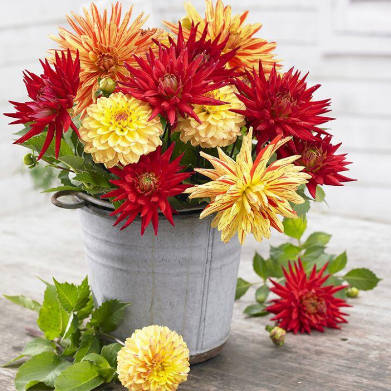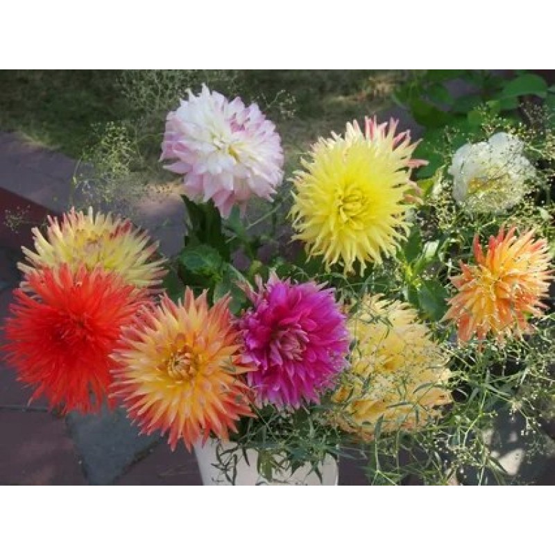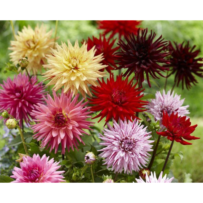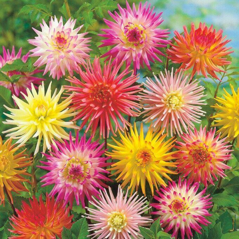 Яркая смесь из кактусовидных георгин. Растения высотой около 130 см. Цветы крупные, самых разнообразных оттенков. Цветет с июля по октябрь. Используют в цветниках большими группами на клумбах. Прекрасный материал для срезки.