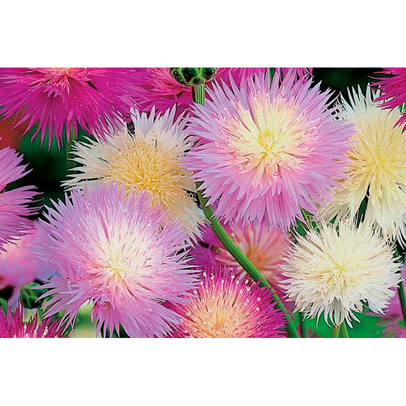 Обильноцветущая смесь однолетнего василька! Куст прямостоячий и ветвистый, 65-70 см высотой. Соцветия крупные, диаметром 4-6 см, изящной формы за счет глубоко вырезанных краев венчика. Василек порадует цветением до самых заморозков. Используется в групповых и одиночных посадках, для цветников и клумб. Подходит для срезки. Отличный медонос.