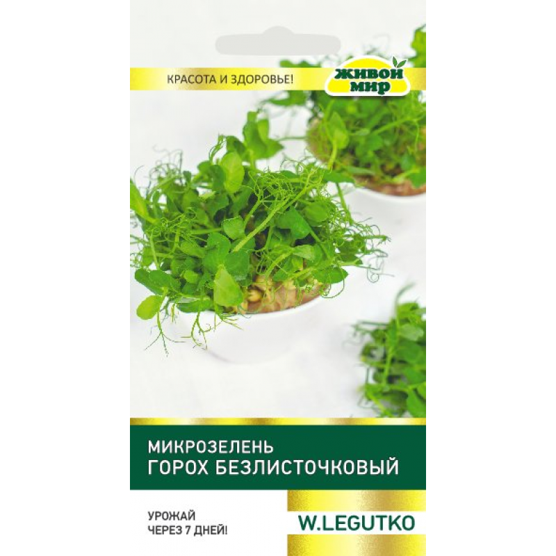 Микрозелень гороха безлисточковый (W. Legutko) — это семена для быстрого выращивания питательной зелени в домашних условиях. Урожай готов к сбору уже через 7-10 дней после посева, что делает этот сорт идеальным для тех, кто ценит свежесть и пользу.