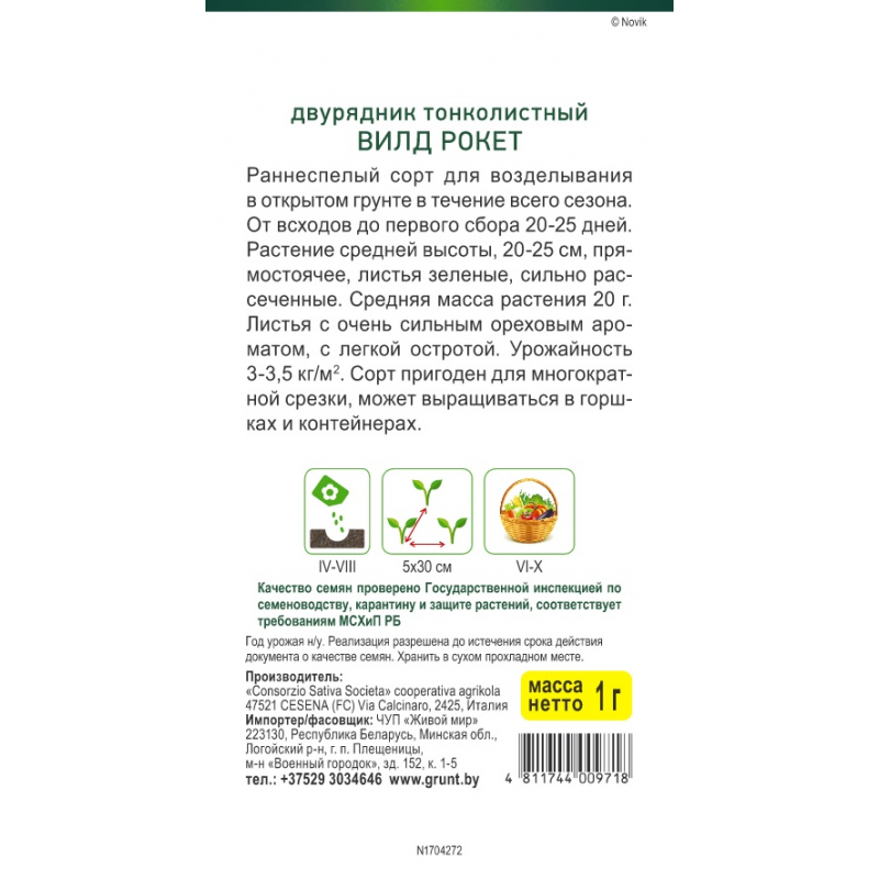 Листья с очень сильным ореховым ароматом, с легкой остротой. Урожайность 3-3,5 кг/м.кв. Сорт пригоден для многократной срезки, может выращиваться в горшках и контейнерах.