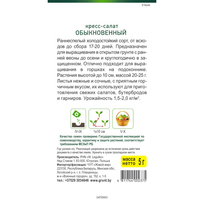 Раннеспелый, холодостойкий сорт, от всходов до сбора 17-20 дней.