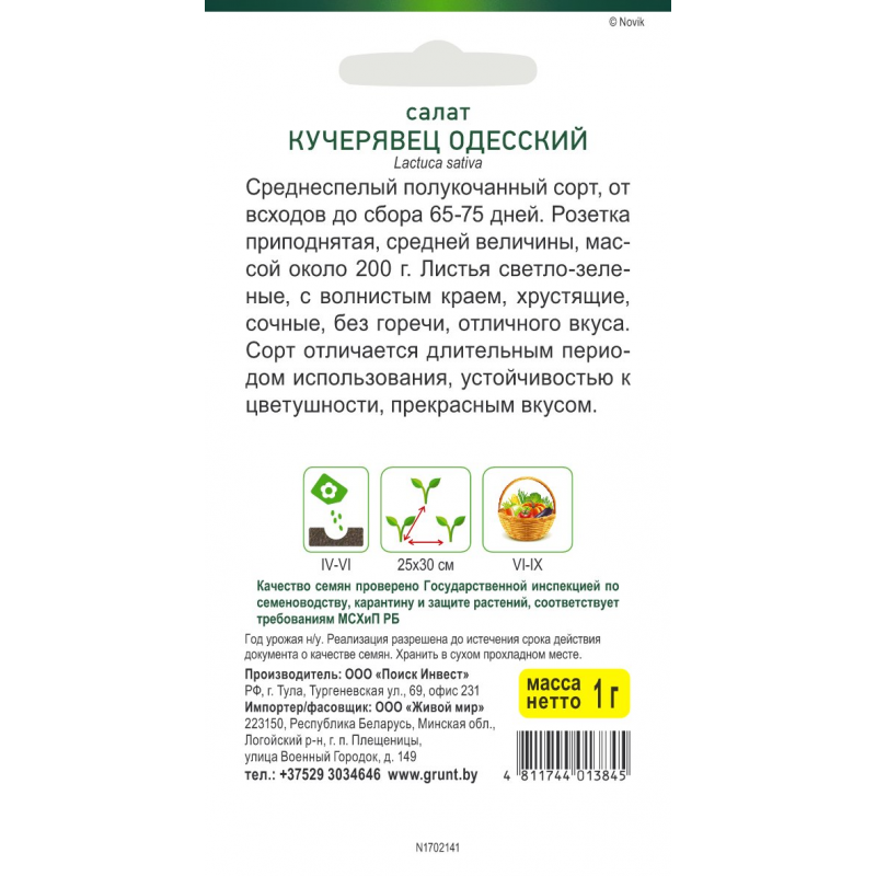 Среднеспелый Среднеспелый полукочанный сорт, от всходов до сбора 65-75 дней. Розетка приподнятая, средней величины, массой около 200 г. Листья светло-зеленые, с волнистым краем, хрустящие, сочные, без горечи, отличного вкуса. Сорт отличается длительным периодом использования, устойчивостью к цветушности, прекрасным вкусом.