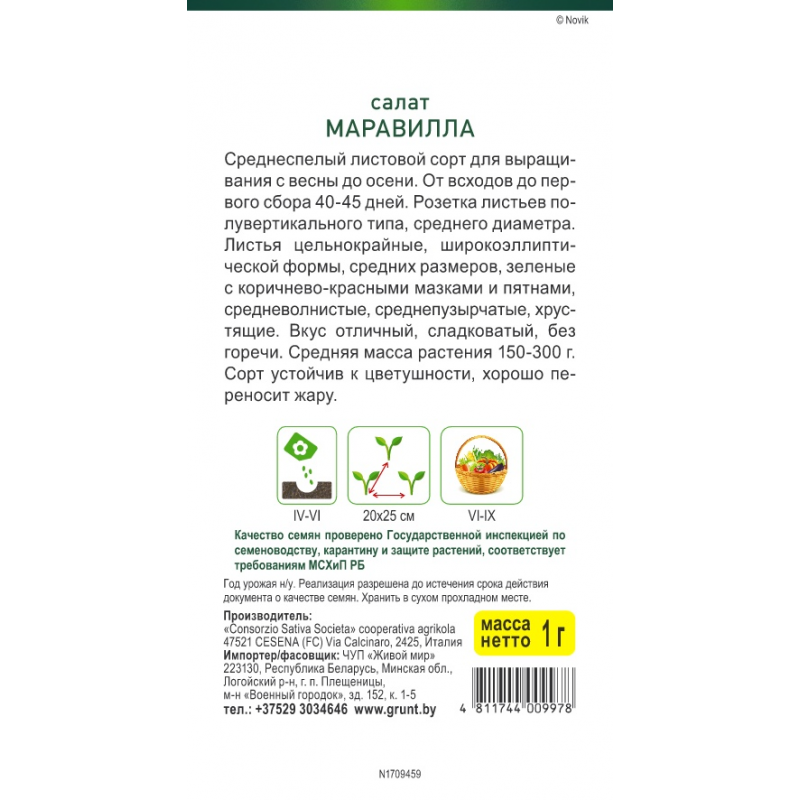 Среднеспелый Среднеспелый листовой сорт для выращивания с весны до осени. От всходов до первого сбора 40-45 дней. Розетка листьев полувертикального типа, среднего диаметра. Листья цельнокрайные, широкоэллиптической формы, средних размеров, зеленые с коричнево-красными мазками и пятнами, средневолнистые, среднепузырчатые, хрустящие. Вкус отличный, сладковатый, без горечи. Средняя масса растения 150-300 г. Сорт устойчив к цветушности, хорошо переносит жару.