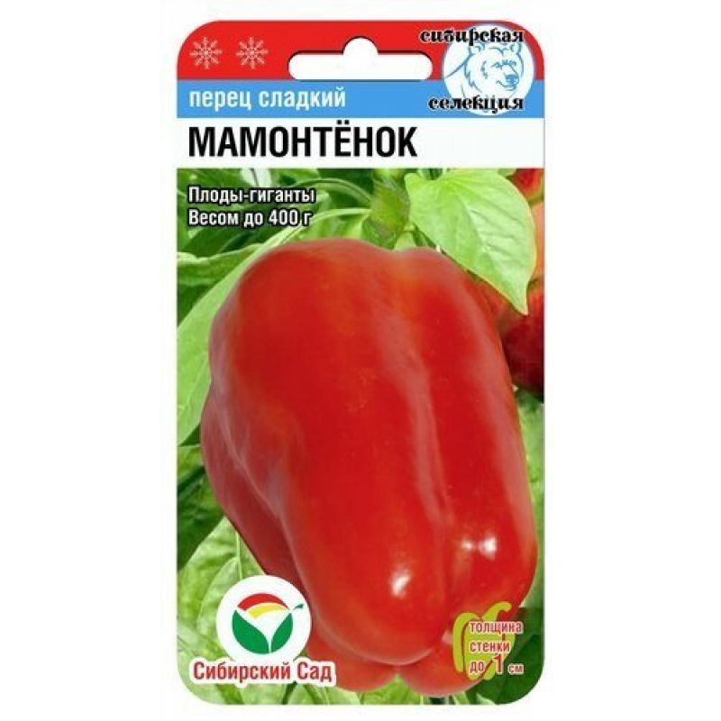 Среднеспелый, урожайный, крупноплодный сорт для открытого грунта и пленочных укрытий. Растение среднерослое, компактное, высотой 50-55 см. Плоды массой до 250 г, удлиненно- призмовидной формы, напоминают хобот мамонта, некоторые до 30 см длиной. В технической спелости темно-зеленые, в биологической- ярко-красные, толстостенные, сочные, вкусные. Урожайность сорта высокая. Сорт предназначен для салатных целей и кулинарной переработки. Посев на рассаду производят за 60-70 дней до высадки растений на постоянное место. Оптимальная постоянная температура прорастания семян 26-28°С. При высадке в грунт на 1 кв. м. размещают 5 растений.
