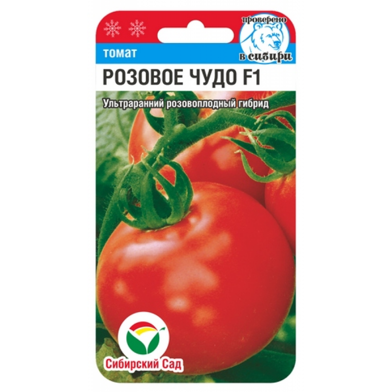 Гибрид РОЗОВОЕ ЧУДО F1 ультраранний, от всходов до начала созревания плодов всего 82-85 дней. Достоин внимания любителей томатов с малиновой окраской плодов. Растение компактное, среднеоблиственное, высотой 100-110 см. Первая кисть закладывается над 5-6 листом, последующие через 1-2 листа. В кисти формируется 6-7 плодов массой 100-110 г. Томаты округлые, гладкие, плотные и вкусные, малинового цвета. Прекрасно переносят транспортировку, хорошо дозариваются. Выход стандартных плодов 98%, урожайность 17-19 кг с 1 кв. м. Гибрид устойчив к основным заболеваниям томатов, рекомендуется для получения ранней продукции в пленочных теплицах и открытом грунте.