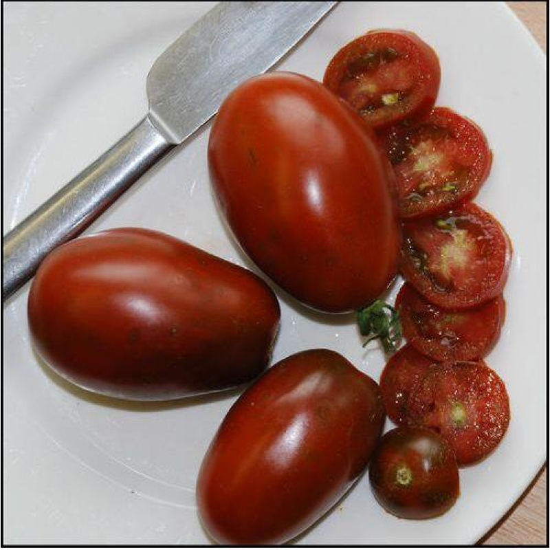 Фантастически урожайный сорт. Очень красивые сливовидные плоды шоколадного цвета. Очень здоровые растения – почти не поражаются болезнями томата. Среднеспелый сорт – 110-120 дней от всходов до плодоношения. Индетерминантный, высокорослый. Кисть простая, состоящая из 6-8 плодов. Плоды сливовидной формы, плотные, блестящие, массой до 120 г, в биологической спелости шоколадного цвета. Очень вкусные. Назначение – десертное и цельноплодное консервирование. В условиях Ленинградской области не поражались фитофторозом.