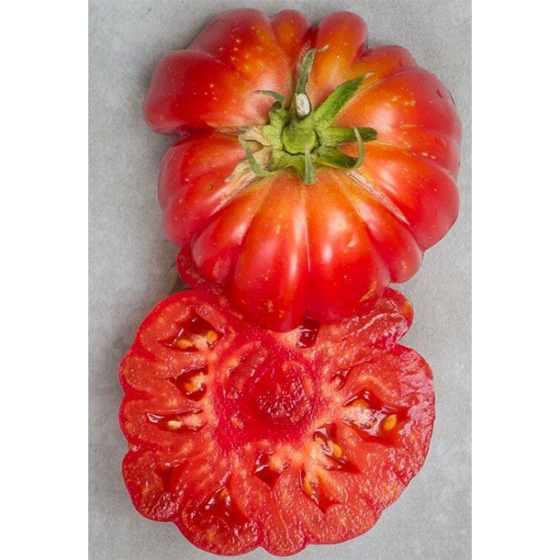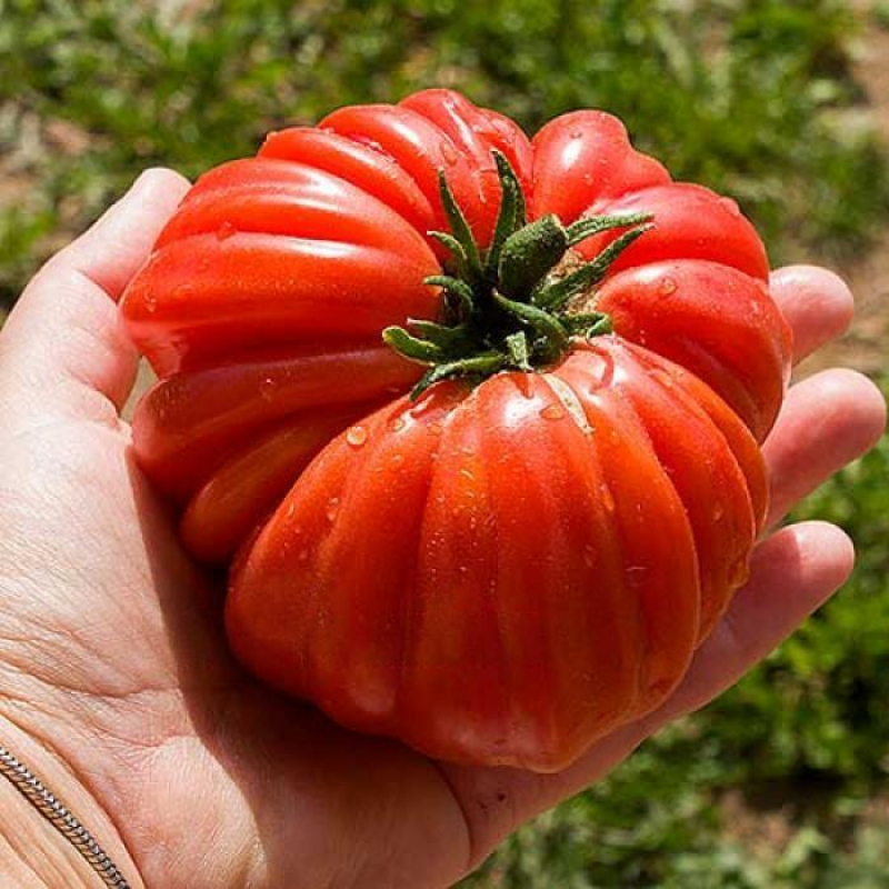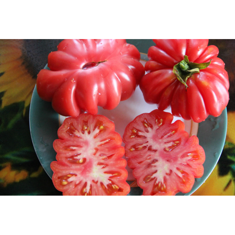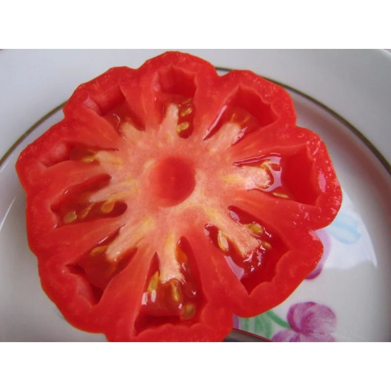 Кисть простая, с 3-4 ярко-красным крупными, мясистыми плодами, массой 250-350 грамм. Плоды очень интересные, плоские, с ярко выраженной ребристостью создающей впечатление, будто томат состоит из отдельных долек. Мякоть их очень нежная, приятного вкуса.