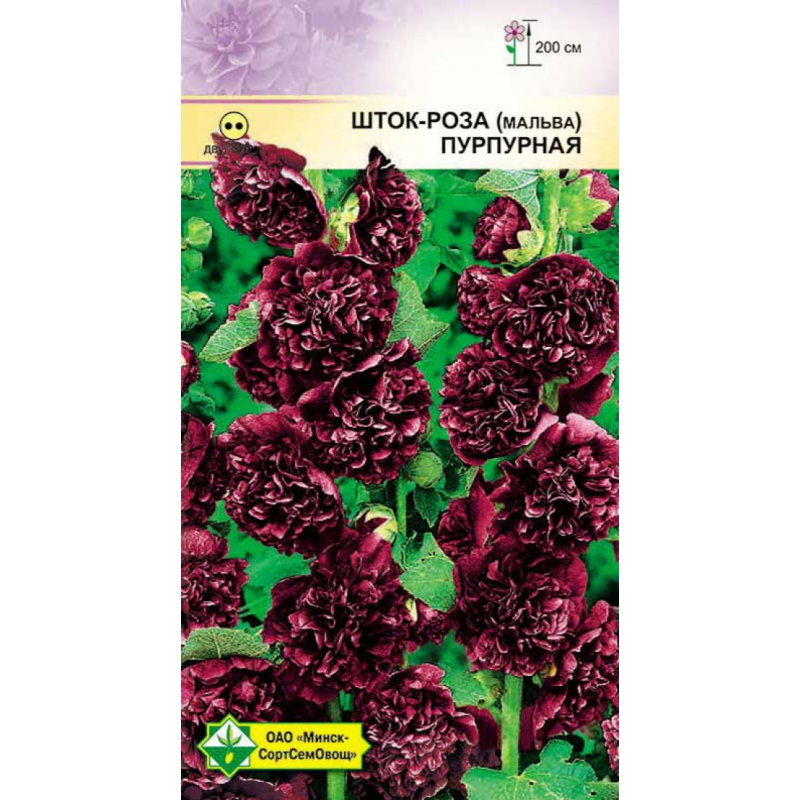 Двулетнее растение высотой до 2 м. Цветки пурпурные, махровые, в диаметре 10-12 см, собраны в изящные колосовидные соцветия. Для декорирования оград и зданий, прекрасно смотрится на заднем плане цветника. В букете сохраняется до 10 дней. Семена высевают в конце мая-начале июня. На постоянное место пересаживают с комом земли в конце августа. Хорошо зимует при легком укрытии.Качество семян соответствует ГОСТу 12260-81 и Постановлению МСХП РБ от 29.10.2015г. №37.