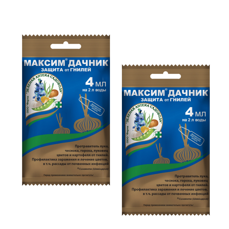 Максим дачник. Для чего и где применять: для протравливания посадочного материала от почвенной инфекции-лука и чеснока от гнилей; семенного картофеля от парши и ризоктониоза; гороха от фузариоза, гнилей, плесневения семян; луковиц, клубней, корневищ цветов от фузариоза и гнилей; для лечения цветочных культур и предотвращения заражения рассады почвенными инфекциями. Как применять: замачивать посадочный материал в течение 30 минут или опрыскивать; перед посадкой-перед закладкой на хранение; поливать почву под корень больного растения; после посева семян и высадки рассады. Действие и результат: антибиотик защитно-контактного действия; дезинфицирует луковицы, клубни, корневища, почву; создает защитный барьер на поверхности посадочного материала и в прикорневой зоне в почве; защищает растения весь период хранения и роста-лечит заболевшие растения. Безопасность и экология: 3 класс (умеренно опасное вещество); сигнальная красная окраска; аналог природного антибиотика, выделенного из почвенных бактерий; безопасен для полезной микрофлоры почвы. ** Саженцы Декоративные Сирень Гортензия Кустарники Хвойные Ель Пихта Плодовые Ранетка Яблоня Груша Вишня Виноград Жимолость Слива Смородина Крыжовник Черемуха Комнатные Цветы Роза Гладиолус Тюльпаны Нарциссы Цикламен Лилия Пион Ирис Флоксы Фиалка Крокус Рассада Томаты Огурцы Перец Кабачки Патиссоны Фасоль Горох Лук Грядка Цветник Клумба Сад Огород Дача Дом