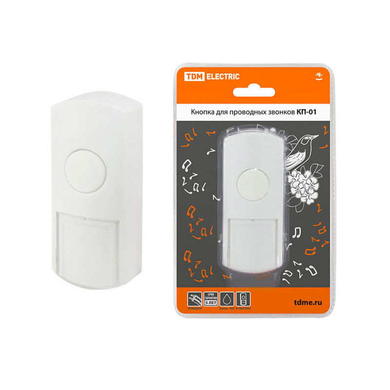 Проводная кнопка звонка TDM КП-01 белого цвета для накладного монтажа. Питание от сети 220 В. Степень защиты IP44 обеспечивает надежную работу при установке снаружи помещений.