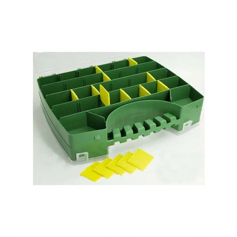 Органайзер для мелкого крепежа, инструмента и оснастки. Подходит для хранения рыболовных снастей. Изготовлен из прочного пластика, отличается долговечностью, высокой степенью износа, устойчив к механическим повреждениям, морозу и влаге. Органайзер прочно закрывается и предотвращает выпадение предметов.