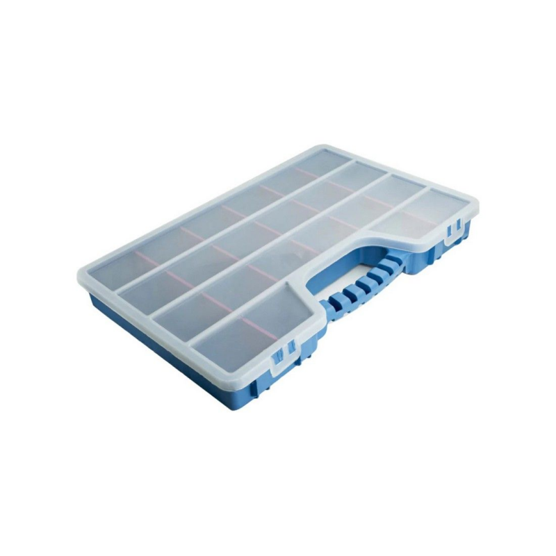 Органайзер для мелкого крепежа, инструмента и оснастки. Подходит для хранения рыболовных снастей. Изготовлен из прочного пластика, отличается долговечностью, высокой степенью износа, устойчив к механическим повреждениям, морозу и влаге. Органайзер прочно закрывается и предотвращает выпадение предметов.