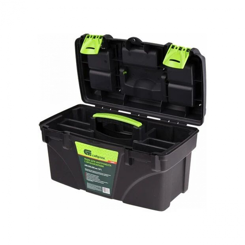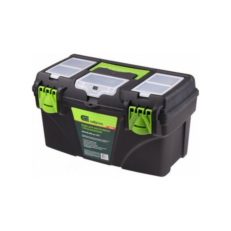 Ящик для инструментов 18 ”, с органайзерами СИБРТЕХ 90808 представляет собой удобный контейнер с отдельными емкостями под крепеж и различные мелочи. Пластиковая рукоятка удобна для транспортировки нагруженного ящика. Есть два замка для запирания крышки.