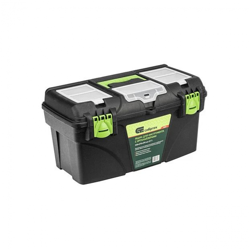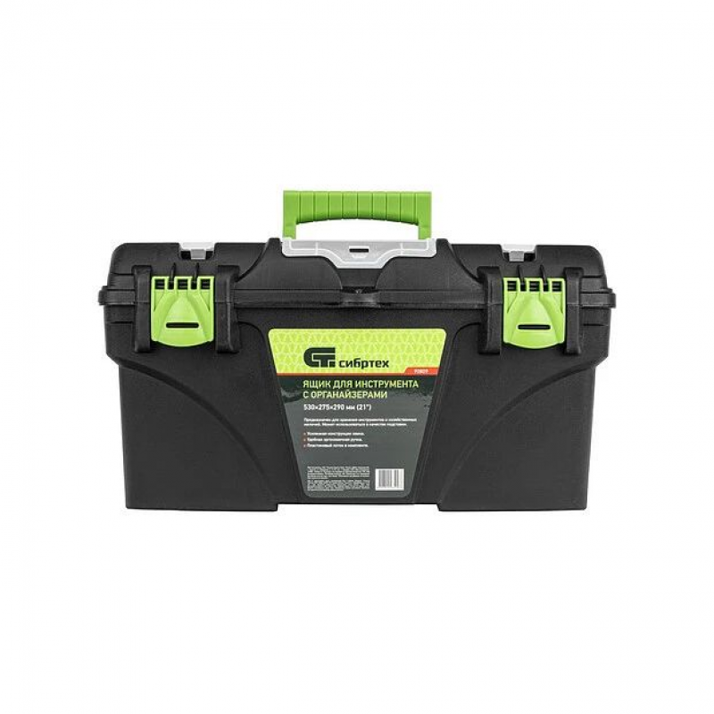 Ящик Сибртех 90809, 21 дюйм, с органайзерами, используется для хранения и транспортировки инструментов, оснастки, крепежей, хозяйственных мелочей и других предметов. Крышка и замок усилены трехрядными петлями, поэтому он выдерживает вес содержимого до 50 кг. Ящик можно брать в поездку, также он пригодится дома, на даче или в гараже.
