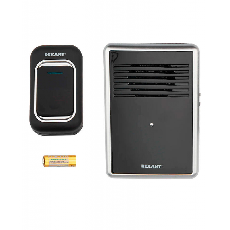 Беспроводной цифровой звонок REXANT RX-30 черного цвета. В комплекте: приемник с динамиком и беспроводная кнопка. Питание приемника: 3 батарейки AA (в комплект не входят), кнопки: батарейка A23. Функции: 25 мелодий, регулировка громкости, световая индикация. Технические характеристики: радиус действия до 150 метров, защита динамика от пыли и влаги IP20, защита кнопки IP44.