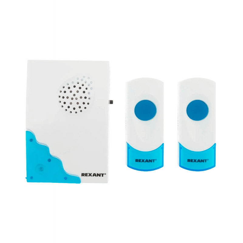 Беспроводной звонок Rexant RX-4 в белом или синем цвете. Комплект включает приемник с динамиком и две беспроводные кнопки. Питание: для звонка — 2 батарейки AAA, для кнопок — A23. Оснащен 32 мелодиями, регулировкой громкости и световой индикацией. Радиус действия — до 100 метров. Степень защиты: динамик IP20, кнопки IP44.