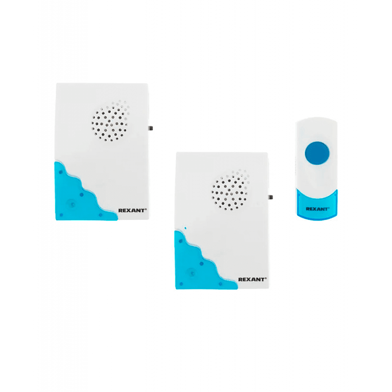 Беспроводной звонок REXANT RX-5 белого или синего цвета для монтажа без проводов. Комплект: звонок с двумя динамиками для громкого звука и одна кнопка вызова. Питание: звонок — 2 батарейки AAA, кнопка — батарейка A23. Функции: 32 мелодии, регулировка громкости, световая индикация. Радиус действия до 100 м. Степень защиты: динамик IP20, кнопка IP44.