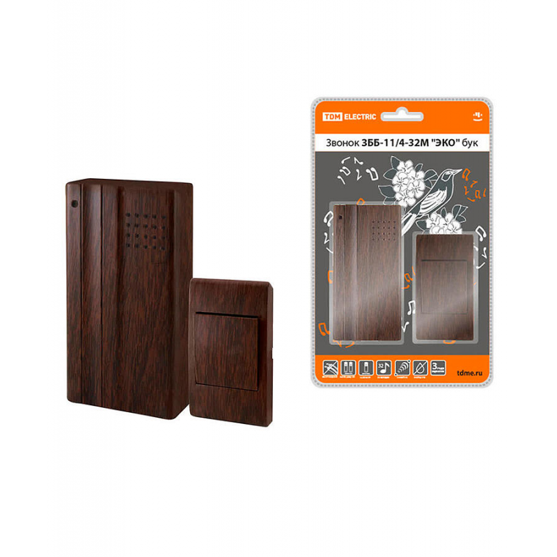 Беспроводной звонок TDM ЗББ-11/4-32М для простого монтажа без прокладки проводов. Комплект включает динамик и одну кнопку. Питание динамика от 2-х батареек AAA, кнопки — от батарейки A23. Оснащен 32 мелодиями, регулировкой громкости и световой индикацией. Радиус действия до 100 метров. Степень защиты IP30. Цвет: бук.