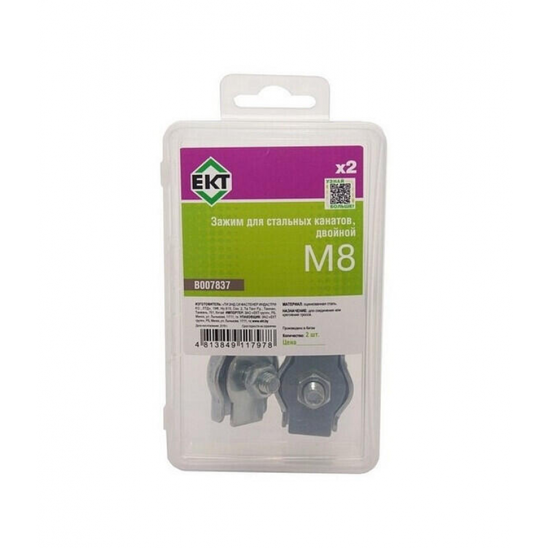Двойной оцинкованный зажим для стальных канатов диаметром 8 мм. Размер зажима: 72 мм. В упаковке: 2 шт.