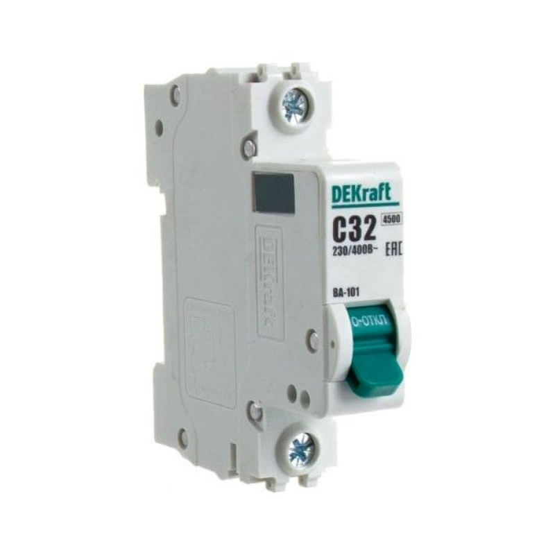Выключатель автоматический DEKraft 1П 32А. Однополюсный автоматический выключатель DEKraft серии ВА-101 с номинальным током 32А идеально подходит для защиты однофазных электрических цепей от перегрузок и коротких замыканий. Устройство оснащено характеристикой срабатывания C, что позволяет выдерживать пусковые токи и эффективно предотвращать аварийные ситуации. Отключающая способность 4,5 кА гарантирует надежную защиту при высоких токах короткого замыкания. Компактный, занимает всего 1 модуль на DIN-рейке, обеспечивая удобство установки в распределительных щитах. Производится в Китае компанией Delixi Electric Ltd, которая известна высоким качеством и надежностью продукции DEKraft. Степень защиты IP20 подходит для эксплуатации в закрытых помещениях.