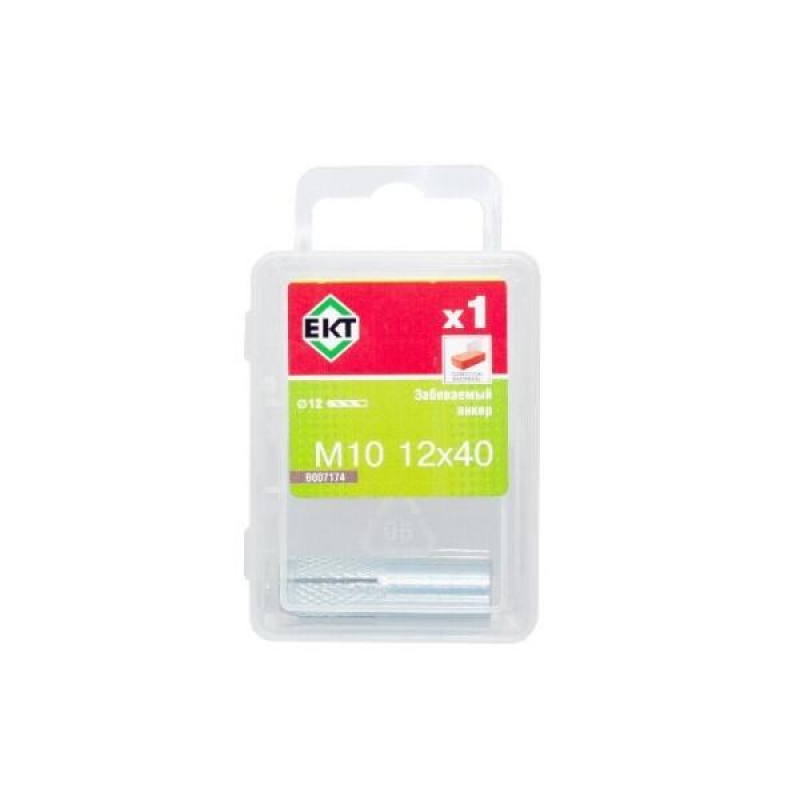 Забивной металлический анкер для ответственного монтажа тяжеловесных конструкций: кабельных трасс, консолей, ворот. Предназначен для полнотелого бетона, природного камня и кирпича. Изготовлен из оцинкованной стали с пассивированием для защиты от коррозии. Конструкция включает полый цилиндр с внутренней резьбой, распорной зоной из четырех сегментов и конусным сердечником для контролируемого расклинивания. Диаметр: 12 мм, длина: 40 мм, диаметр резьбы: М10.