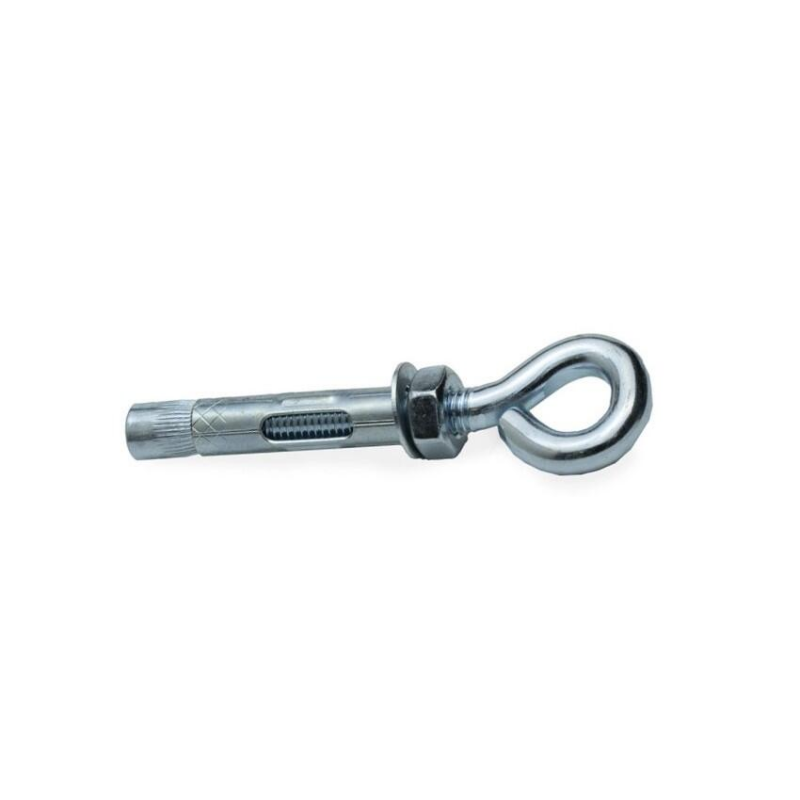 Анкерный болт с кольцом M10 12х70 для надежного крепления тяжелых конструкций к бетону, кирпичу или природному камню. Изготовлен из оцинкованной стали с пассивацией для защиты от коррозии. Конструкция включает болт с резьбой, конусообразную гайку, цилиндрическую подвижную муфту с прорезями и кольцо для удобного подвешивания. При затягивании конусная гайка втягивается, равномерно распирая муфту по всей длине, обеспечивая максимальную прочность крепления.
