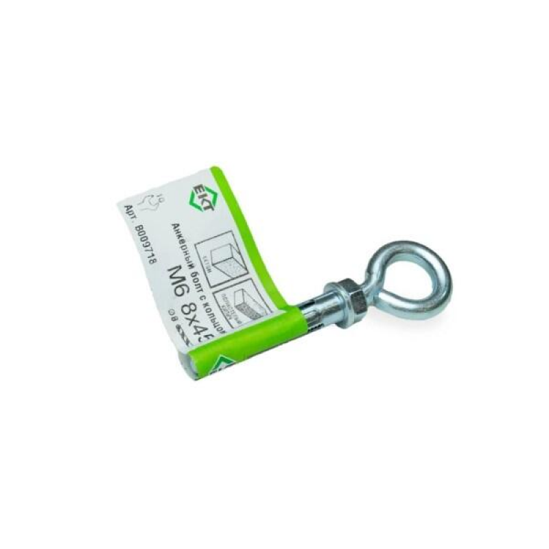 Анкерный болт с кольцом M6 8x45 от бренда ЕКТ предназначен для надежного стационарного крепления и подвешивания тяжелых конструкций. Изготовлен из оцинкованной стали с пассивацией для защиты от коррозии. Конструкция включает болт с резьбой, конусообразную гайку, цилиндрическую подвижную муфту с прорезями и шайбу, что обеспечивает прочное расклинивание в основании. Диаметр: 8 мм, длина: 45 мм.