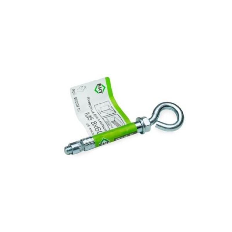 Анкерный болт с кольцом M6 8x60 от ЕКТ предназначен для надежного стационарного крепления и подвешивания тяжелых несъемных конструкций. Изготовлен из оцинкованной стали с пассивацией для защиты от коррозии. Конструкция включает болт с резьбой, конусообразную гайку, цилиндрическую подвижную муфту с прорезями и шайбу, что обеспечивает прочное расклинивание в основании. Предназначен для монтажа в бетон, полнотелый кирпич и природный камень.