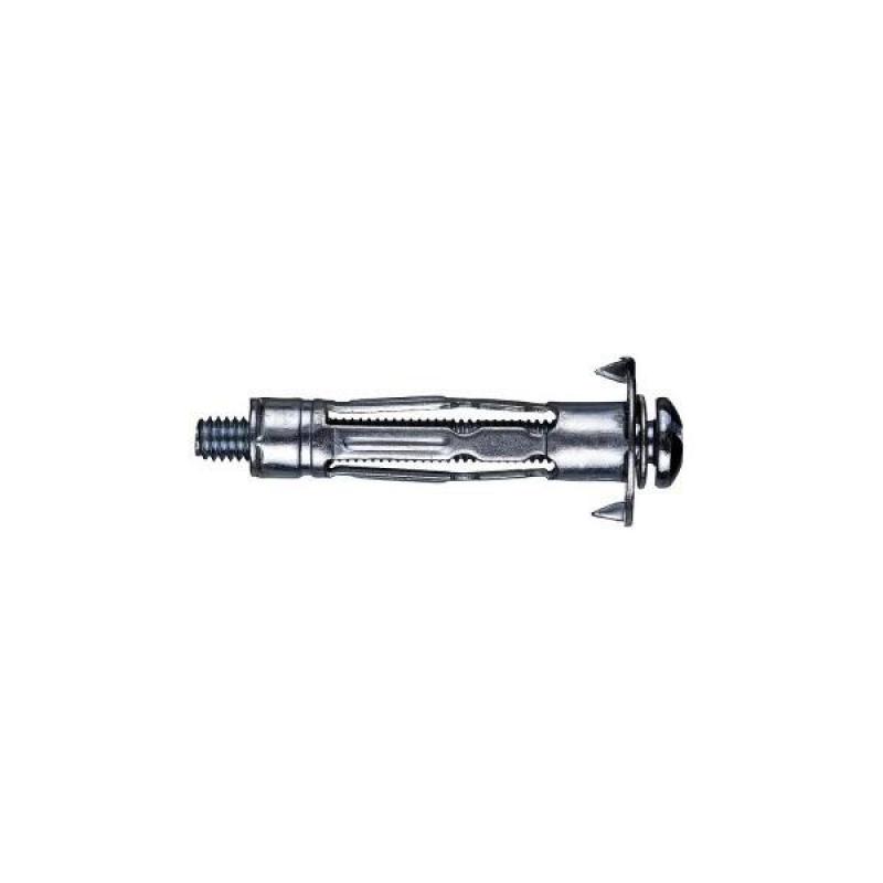Металлический дюбель для надежного крепления в пустотелых конструкциях и листовых материалах: гипсокартоне, ДСП, потолочных перекрытиях и газобетонных блоках. Изготовлен из оцинкованной стали. Конструкция включает цангу с фиксирующими сегментами и стопорный бортик с зубцами для предотвращения проворачивания. Диаметр: 5 мм, Длина: 37 мм. Упаковка: 6 шт.