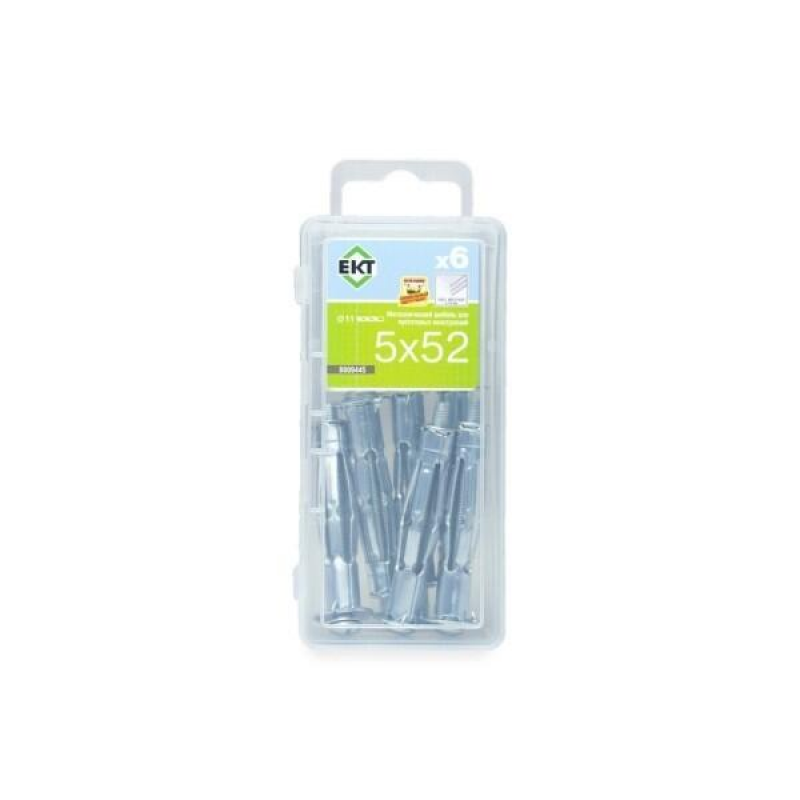 Металлический дюбель для надежного крепления в пустотелых конструкциях и листовых материалах. Диаметр: 5 мм, длина: 52 мм. В упаковке: 6 шт. Изготовлен из оцинкованной стали. Принцип работы: при закручивании винта фиксирующие сегменты цанги раскрываются, обеспечивая прочную фиксацию. Подходит для гипсокартона, ДСП, потолочных перекрытий и газобетонных блоков.